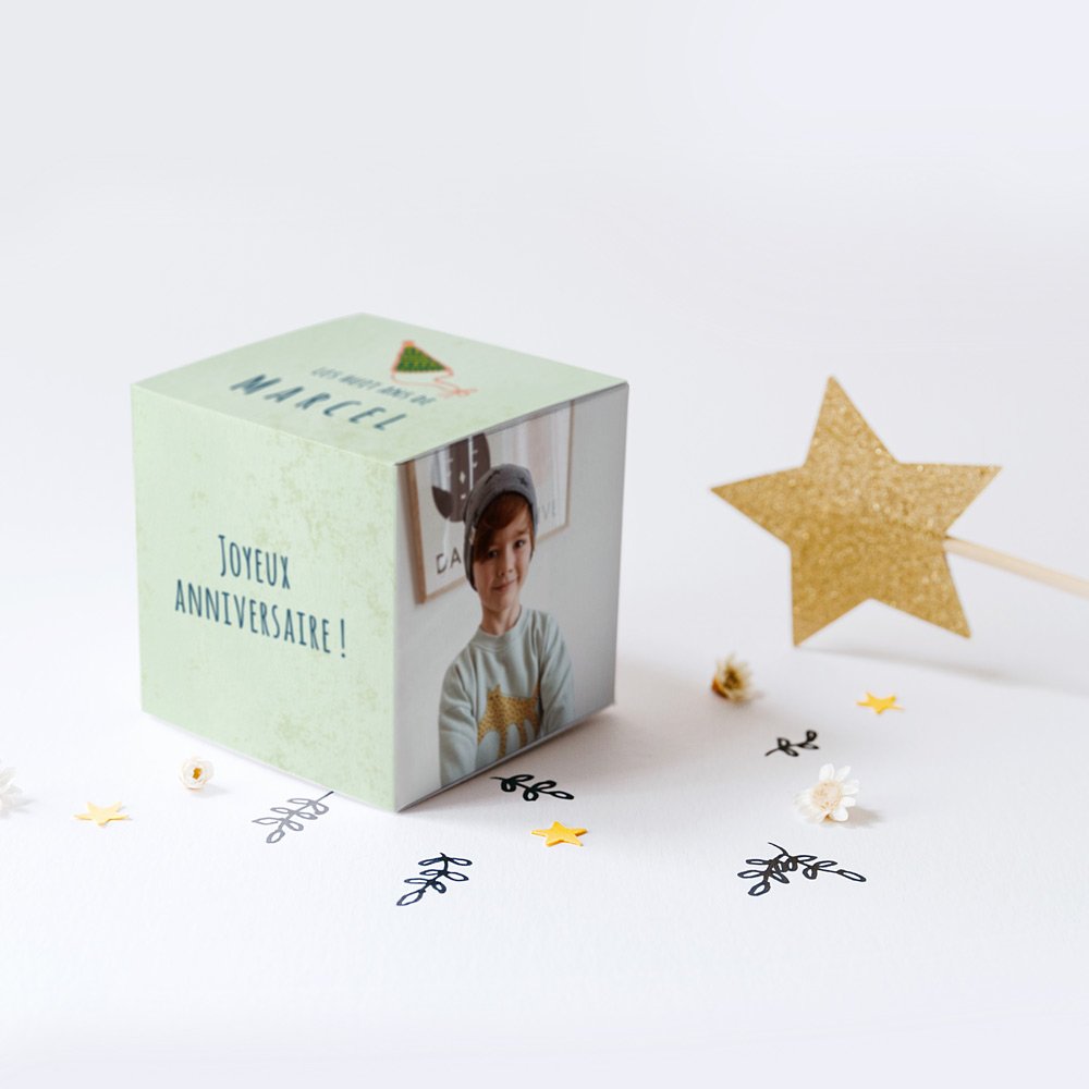 Assortiment de bonbons et autres friandises sucrées, mini figurines, breloques et bijoux fantaisies... faites appel à votre créativité pour garnir votre cube surprise de petites attentions et personnalisez-le avec le prénom de votre enfant, les infos clés de son anniversaire (date, âge...), un petit mot de remerciement...