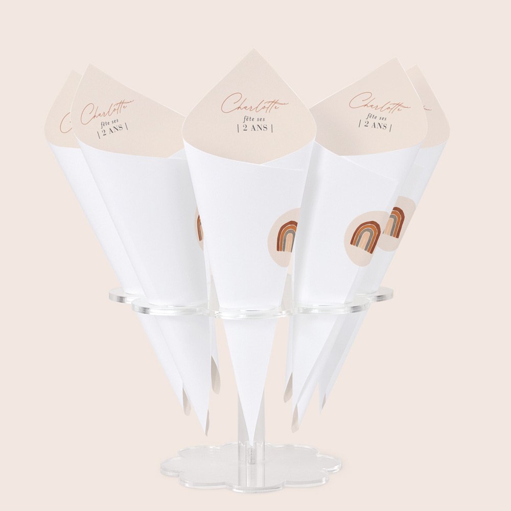 Pour une présentation pratique et esthétique, nous vous conseillons de placer vos cornets sur des porte-cornets (à sélectionner en option), selon votre nombre d'invités. Vous pouvez placer jusqu'à 8 cornets sur un support.