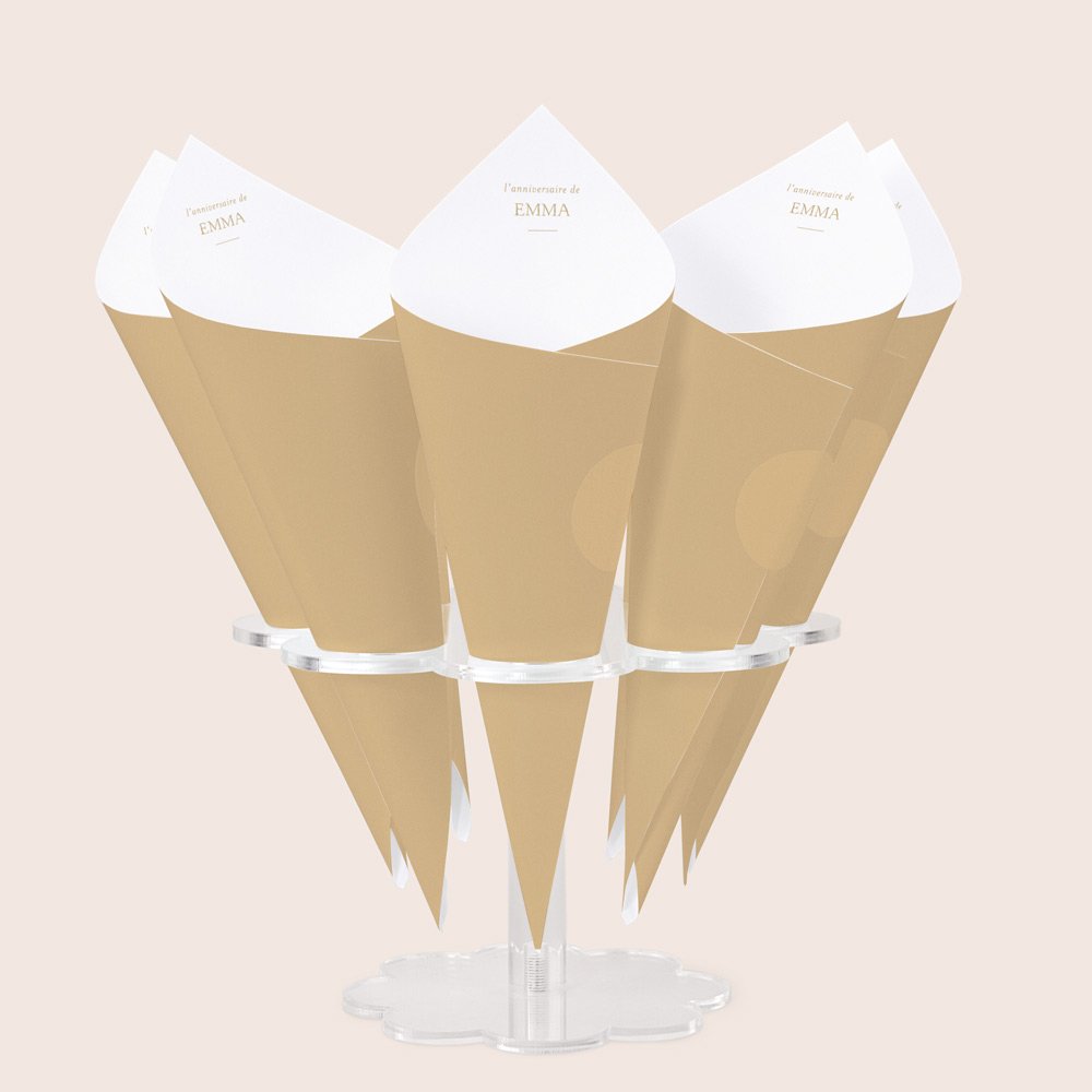 Pour une présentation pratique et esthétique, nous vous conseillons de placer vos cornets sur des porte-cornets (à sélectionner en option), selon votre nombre d'invités. Vous pouvez placer jusqu'à 8 cornets sur un support.