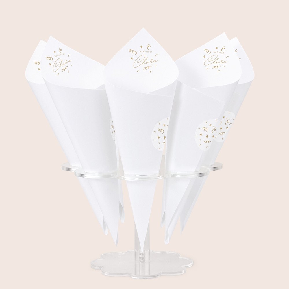 Pour une présentation pratique et esthétique, nous vous conseillons de placer vos cornets sur des porte-cornets (à sélectionner en option), selon votre nombre d'invités. Vous pouvez placer jusqu'à 8 cornets sur un support.