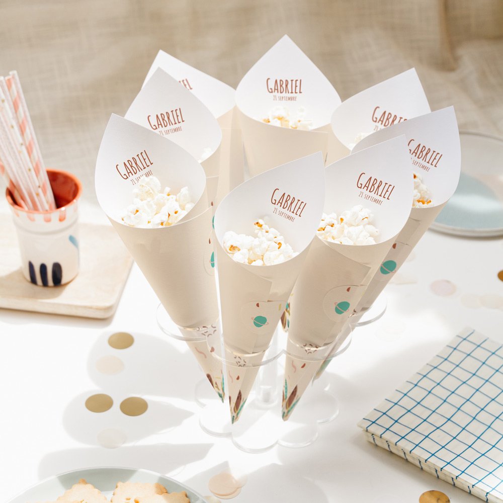 Pour une présentation pratique et esthétique, nous vous conseillons de placer vos cornets sur des porte-cornets (à sélectionner en option), selon votre nombre d'invités. Vous pouvez placer jusqu'à 8 cornets sur un support.