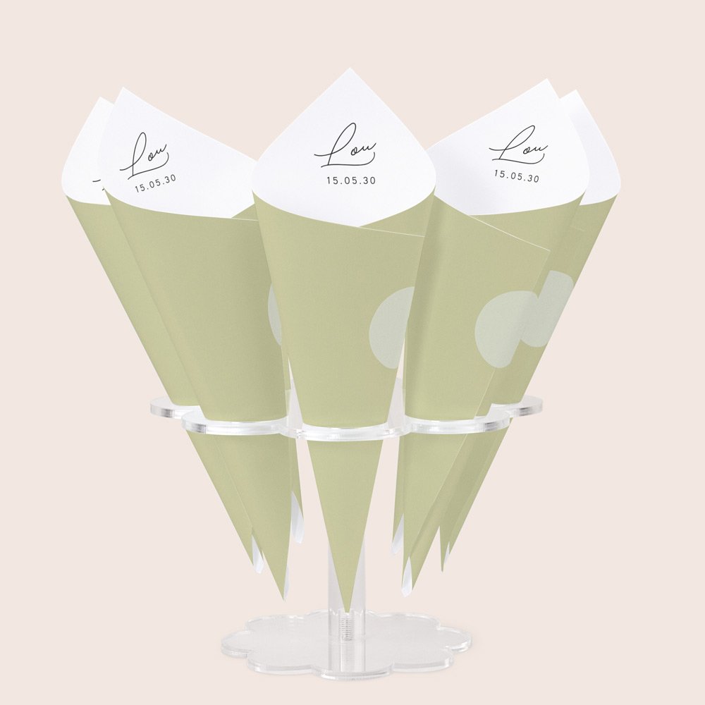 Pour une présentation pratique et esthétique, nous vous conseillons de placer vos cornets sur des porte-cornets (à sélectionner en option), selon votre nombre d'invités. Vous pouvez placer jusqu'à 8 cornets sur un support.