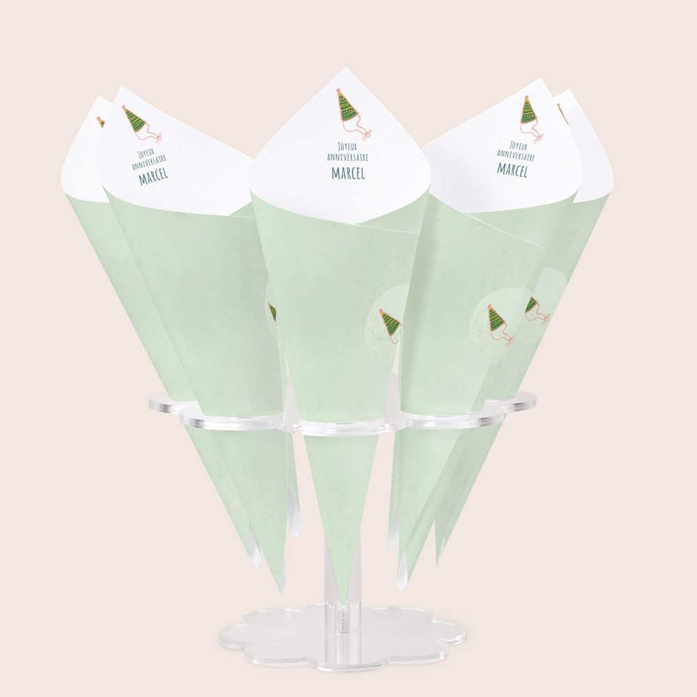 Pour une présentation pratique et esthétique, nous vous conseillons de placer vos cornets sur des porte-cornets (à sélectionner en option), selon votre nombre d'invités. Vous pouvez placer jusqu'à 8 cornets sur un support.