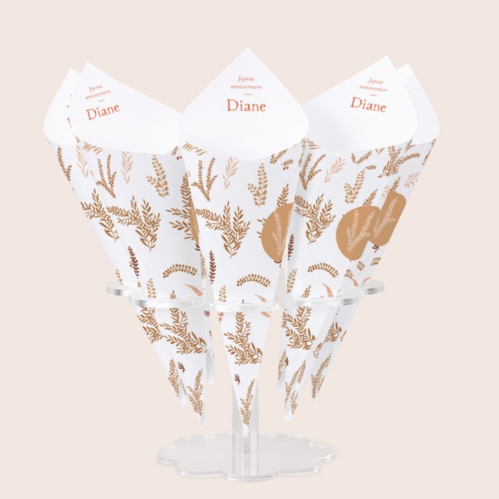 Pour une présentation pratique et esthétique, nous vous conseillons de placer vos cornets sur des porte-cornets (à sélectionner en option), selon votre nombre d'invités. Vous pouvez placer jusqu'à 8 cornets sur un support.