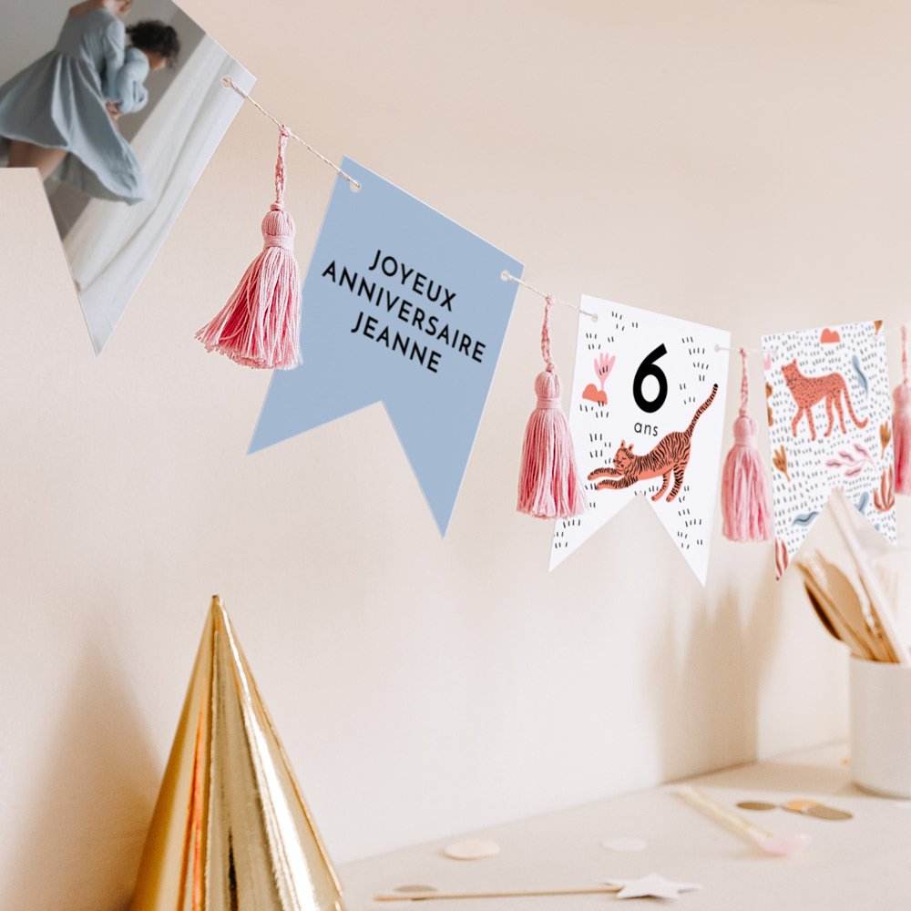 Cette guirlande de 16 fanions recto-verso se personnalise avec la photo de votre enfant, son prénom, son âge, un petit message festif...
