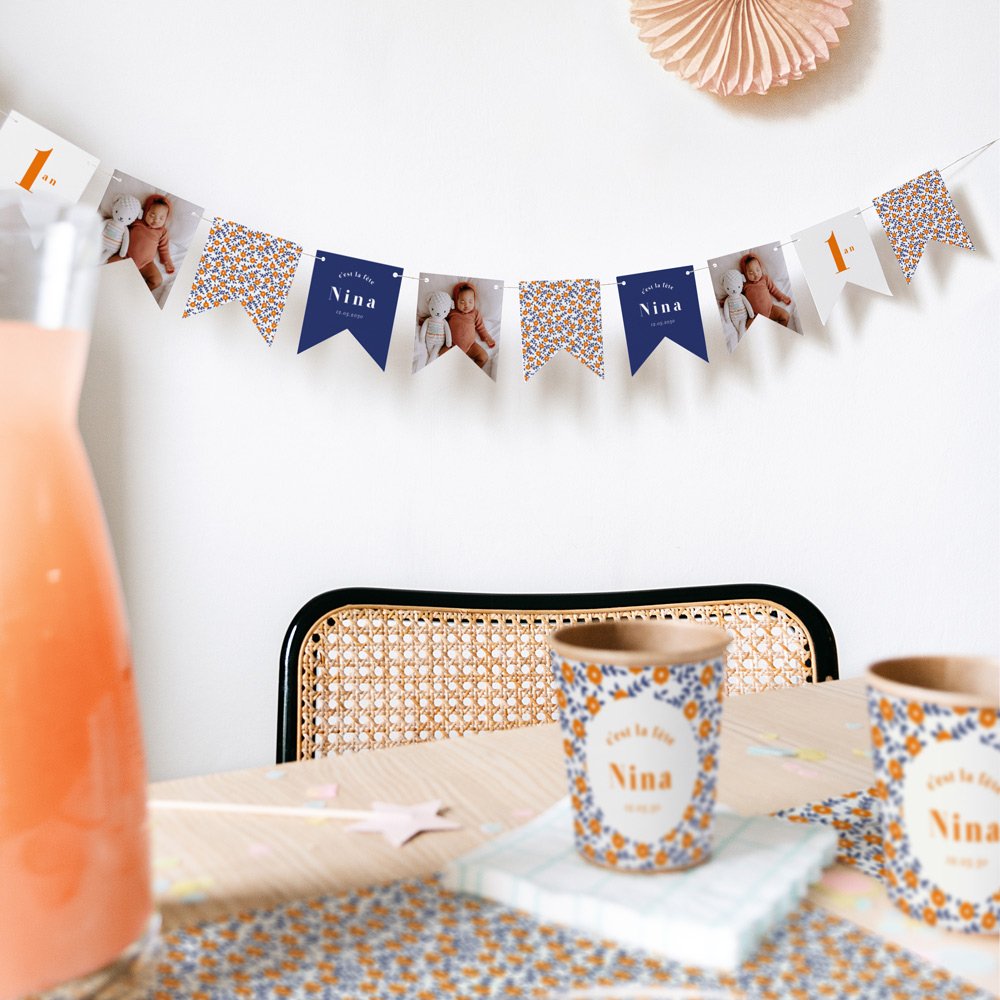 Cette guirlande de 16 fanions recto-verso se personnalise avec la photo de votre enfant, son prénom, son âge, un petit message festif...