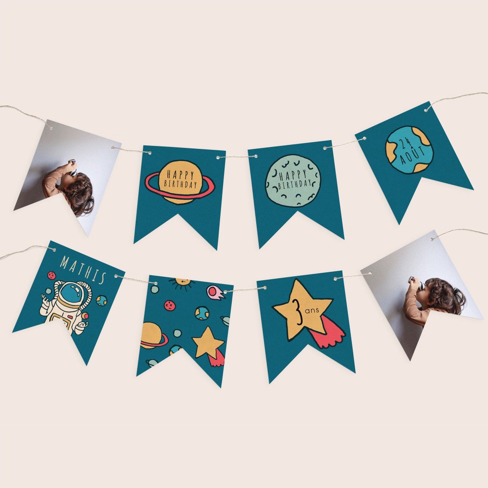 Cette guirlande de 16 fanions recto-verso se personnalise avec la photo de votre enfant, son prénom, son âge, un petit message festif...