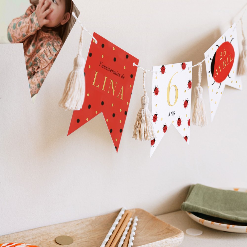 Cette guirlande de 16 fanions recto-verso se personnalise avec la photo de votre enfant, son prénom, son âge, un petit message festif...