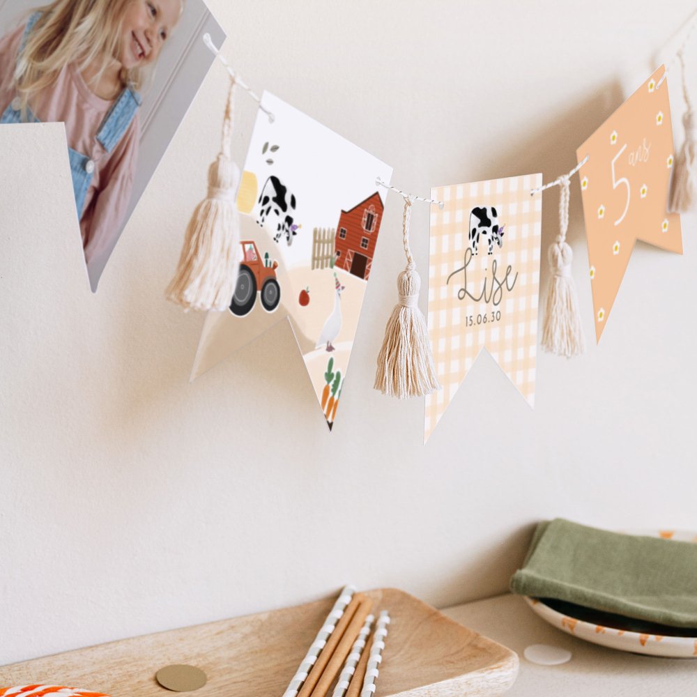 Cette guirlande de 16 fanions recto-verso se personnalise avec la photo de votre enfant, son prénom, son âge, un petit message festif...