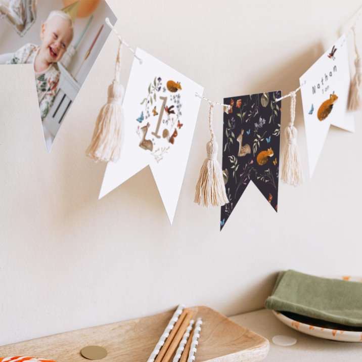 Cette guirlande de 16 fanions recto-verso se personnalise avec la photo de votre enfant, son prénom, son âge, un petit message festif...