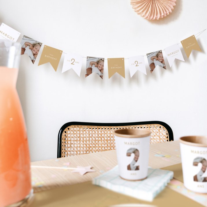 Cette guirlande de 16 fanions recto-verso se personnalise avec la photo de votre enfant, son prénom, son âge, un petit message festif...