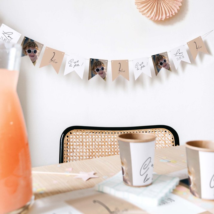 Cette guirlande de 16 fanions recto-verso se personnalise avec la photo de votre enfant, son prénom, son âge, un petit message festif...