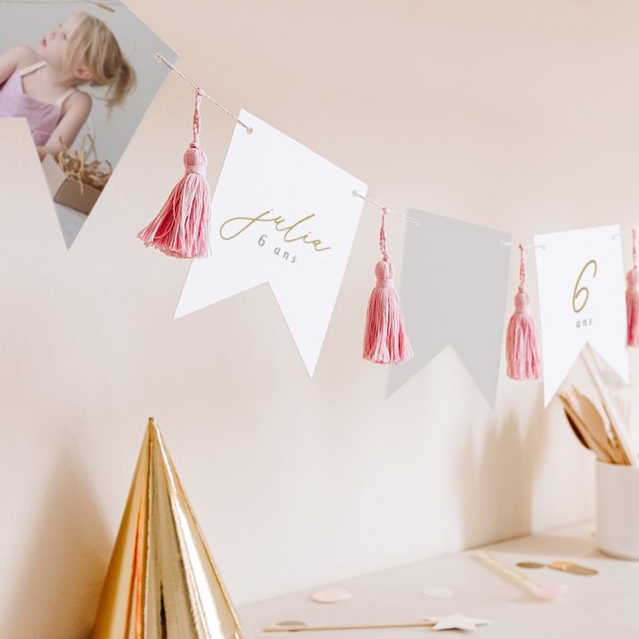 Cette guirlande de 16 fanions recto-verso se personnalise avec la photo de votre enfant, son prénom, son âge, un petit message festif...