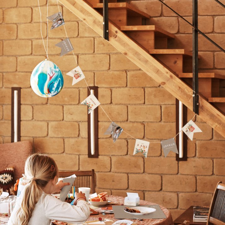 Cette guirlande de 16 fanions recto-verso se personnalise avec la photo de votre enfant, son prénom, son âge, un petit message festif...