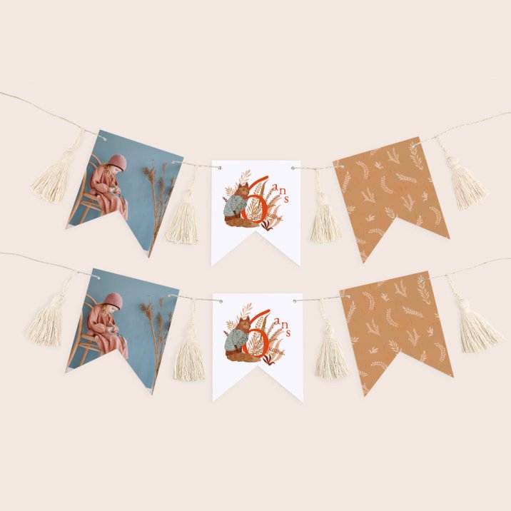 Cette guirlande de 16 fanions recto-verso se personnalise avec la photo de votre enfant, son prénom, son âge, un petit message festif...