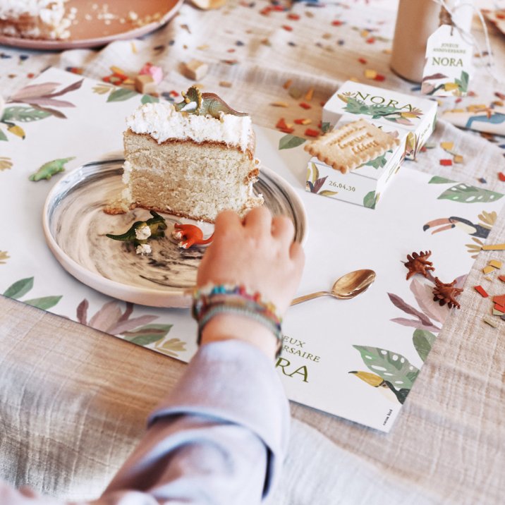 Égayez la table du goûter d'anniversaire de votre enfant avec de jolis sets Mowgli assortis à sa carte d'invitation.