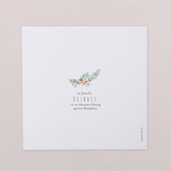 La nature se pare des plus belles décorations de saison sur la carte de vœux Rouge-Gorge. Avec ses délicates esquisses de sapin, pomme de pin, branches de gui, ses décorations festives étoilées et son petit rouge-gorge coloré, elle forme un tableau de Noël enchanté qui réchauffera le cœur de ceux que vous aimez.