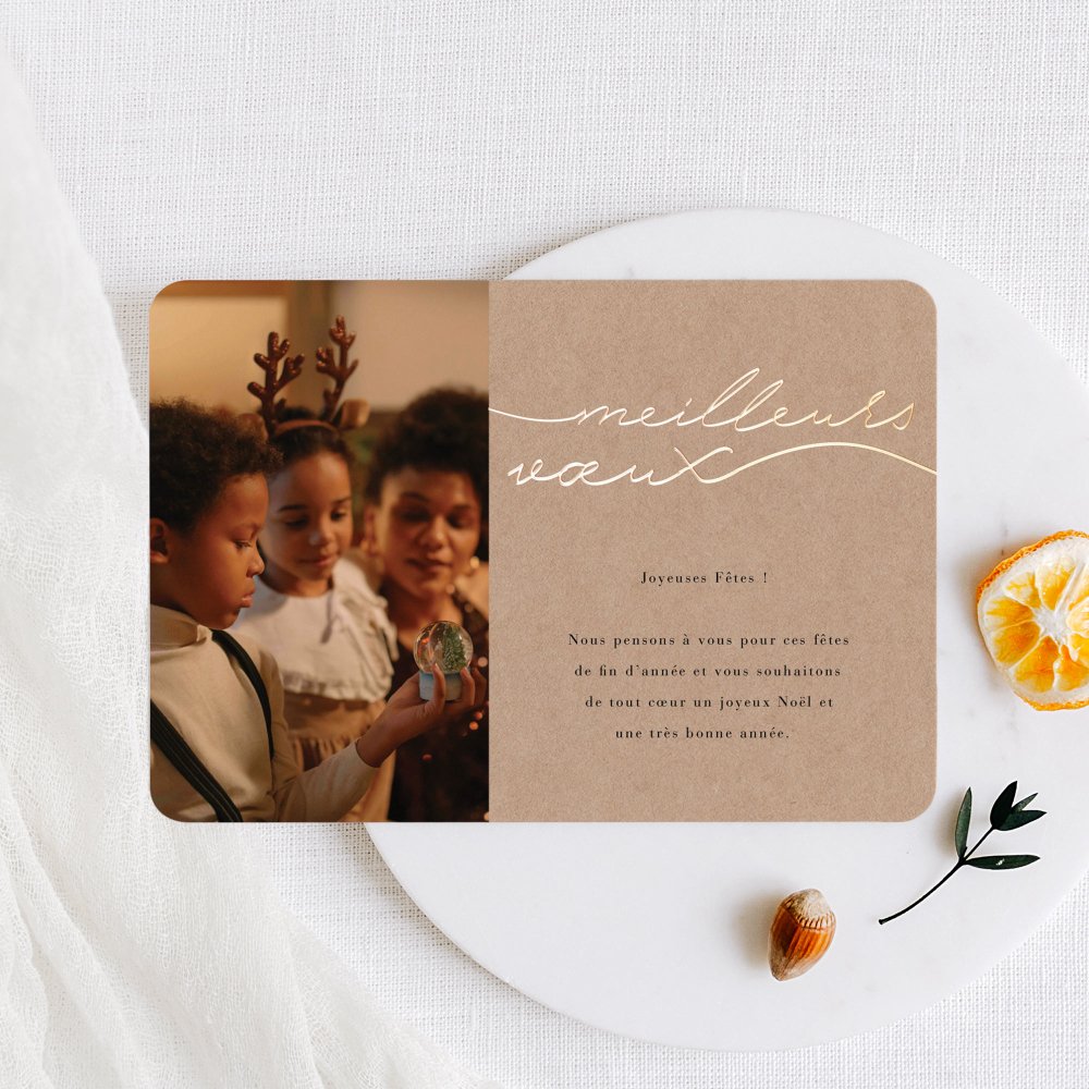 Cette carte de vœux recto-verso présente un format paysage, avec des coins arrondis pour plus de douceur.