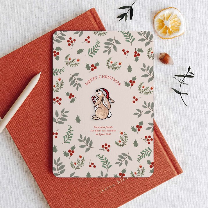 Iconique Père Noël, lapin festif : choisissez l’un de ces deux adorables messagers brodés pour personnaliser votre carte préférée.
