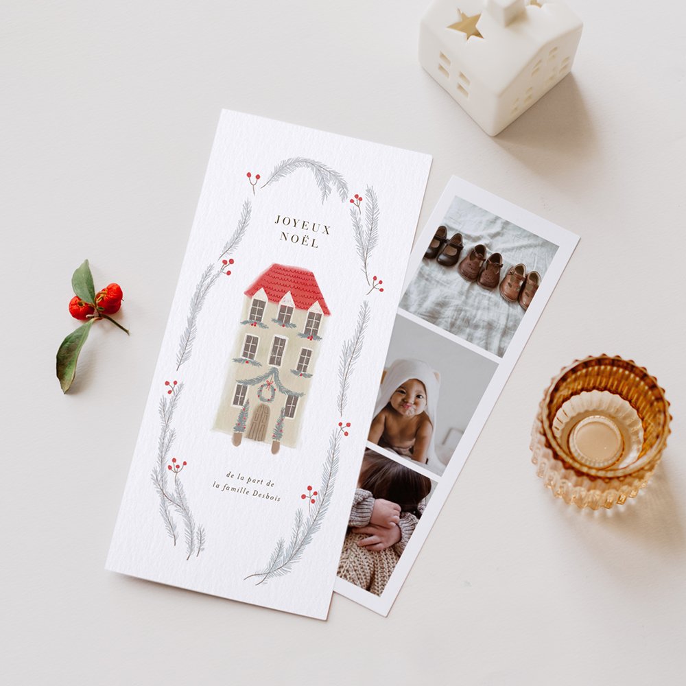 Avec sa jolie maison habillée de décorations et ses délicates illustrations de feuillages de saison, la carte de vœux Christmas Time vous transporte au joyeux temps des célébrations. Une home sweet home transformée par la féérie de Noël, parfaite pour partager vos plus beaux vœux.