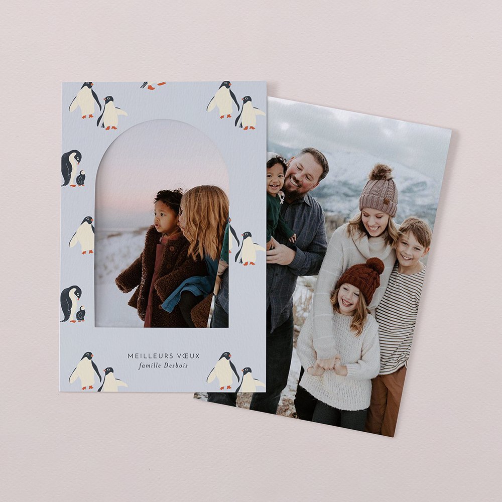 Enchantement assuré avec la carte Sur la Banquise III et son attendrissant thème polaire. Sur ce modèle original mêlant photos et illustrations pleines de candeur, une adorable famille de pingouins se joindra à votre heureuse tribu pour souhaiter le meilleur à vos êtres chers.